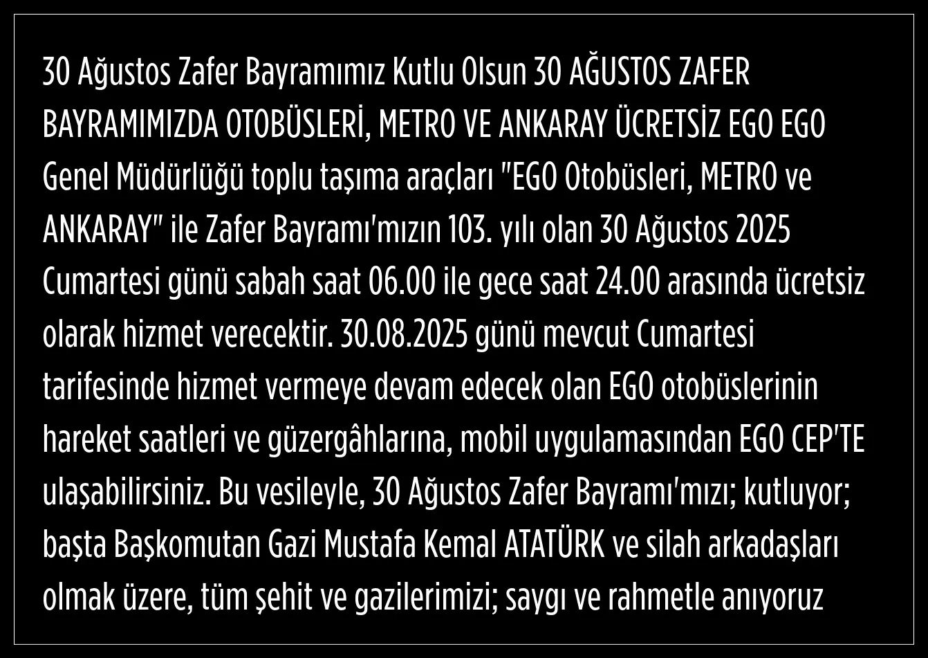 EGO Genel Müdürlüğü, 30 Ağustos Zafer Bayramı nedeniyle Ankara'da ulaşımın 06.00-24.00 saatleri arasında ücretsiz hizmet vereceğini duyurdu.