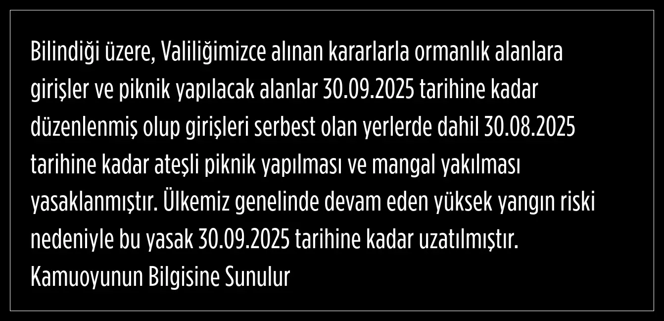 Yapılan açıklamada, 30 Eylül 20025 tarihine kadar, ateşli piknik yapılması ve mangal yakılmasının yasak olduğu belirtildi.