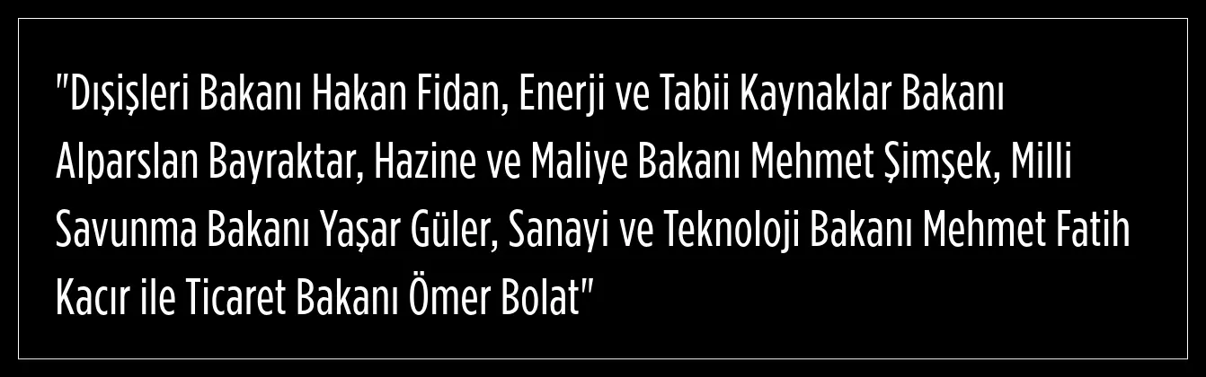 Görüşmede, Cumhurbaşkanı Erdoğan’a Türkiye’den kalabalık bir bakanlar kurulu heyeti eşlik etti. Toplantıya katılan heyette şu isimler de yer aldı:
