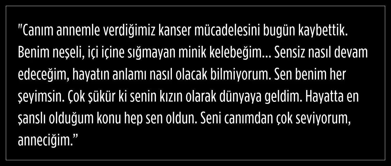 Güzel oyuncu, annesinin acı haberini sosyal medya hesabından yaptığı paylaşımla duyurdu. Paylaşımında hem acısını hem de annesine duyduğu derin sevgiyi dile getiren ünlü oyuncu, duygusal satırlarıyla hayranlarını da hüzne boğdu.