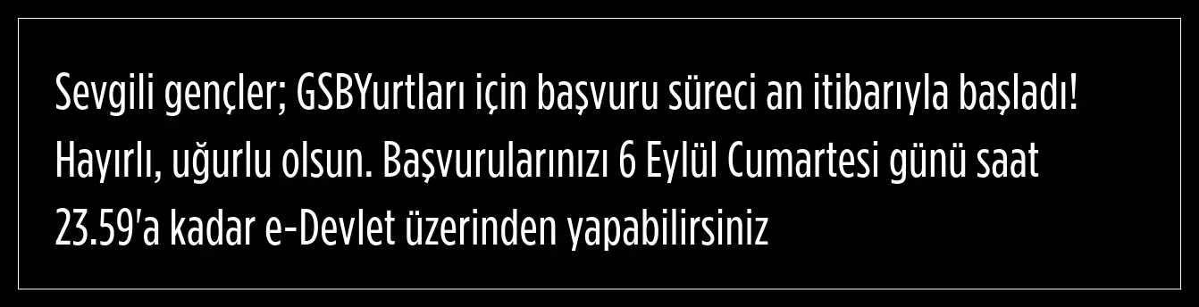 Bakan Bak, sosyal medya hesabı üzerinden yaptığı açıklamada GSB yurtları için başvuru sürecinin başladığını duyurdu.