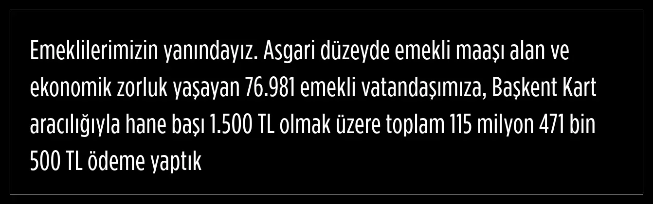 Ankara Büyükşehir, emeklilere destek olmaya devam ediyor. Son olarak hane başı 1.500 TL olmak üzere toplam 115 milyon 471 bin 500 TL ödeme yapıldı.
