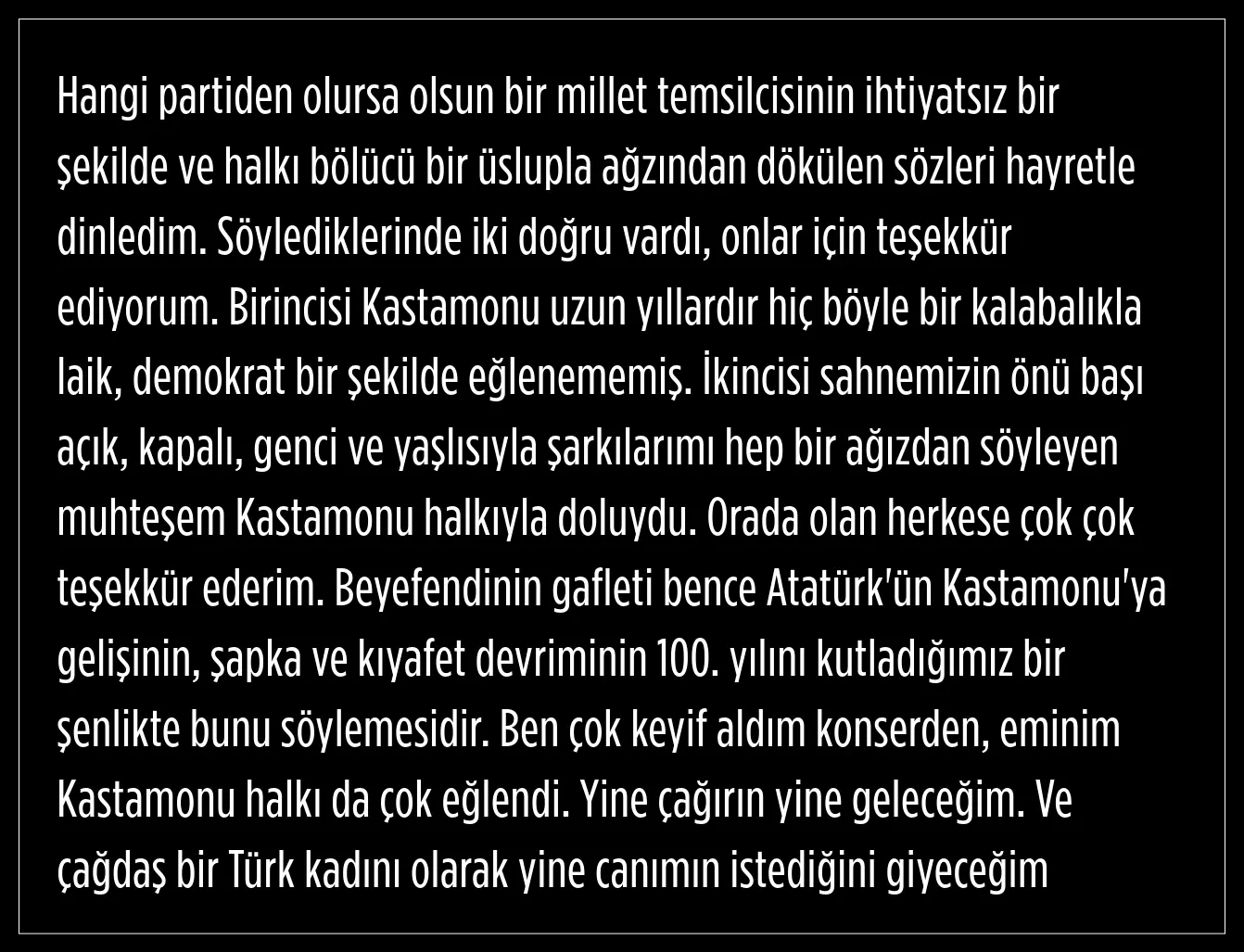 Konserden çok keyif aldığını ve Kastamonu halkının da çok eğlendiğini ifade eden Melek Mosso, çağrılması durumunda yine gideceğini belirtti.