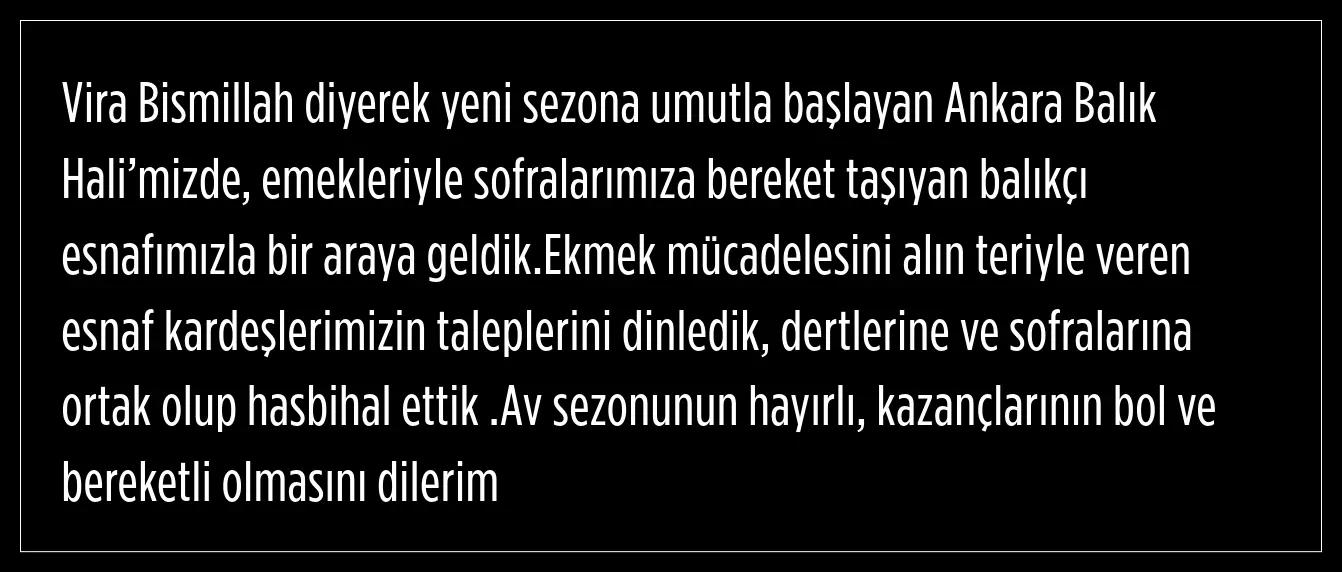 1 Eylül itibarıyla başlayan yeni av sezonunun bereketli geçmesi temennisinde bulunan Oktay, hem balıkçıların kazancının artmasını hem de Ankaralıların sofralarında bol ve sağlıklı balık bulunmasını diledi. Ziyaret sırasında balıkçı esnafının davetini kabul eden Oktay, onlarla birlikte balık ekmek yiyerek sohbet etti.