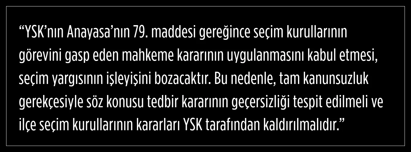 Başvuruda, YSK’den seçim hukukundaki “tam kanunsuzluk” yetkisini kullanarak ilçe seçim kurullarının iptal kararlarını iptal etmesi istendi. Dilekçede şu ifadeler yer aldı:
