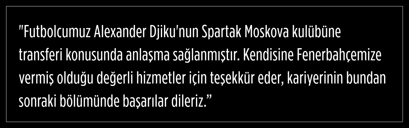 Fenerbahçe, savunmasının güçlü ismi Alexander Djiku'nun Spartak Moskova'ya transfer olduğunu resmen duyurdu. Kulüp, yaptığı açıklamada futbolcuya teşekkür ederek başarılar diledi.