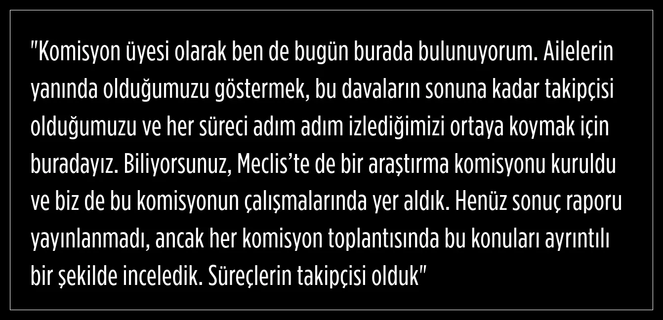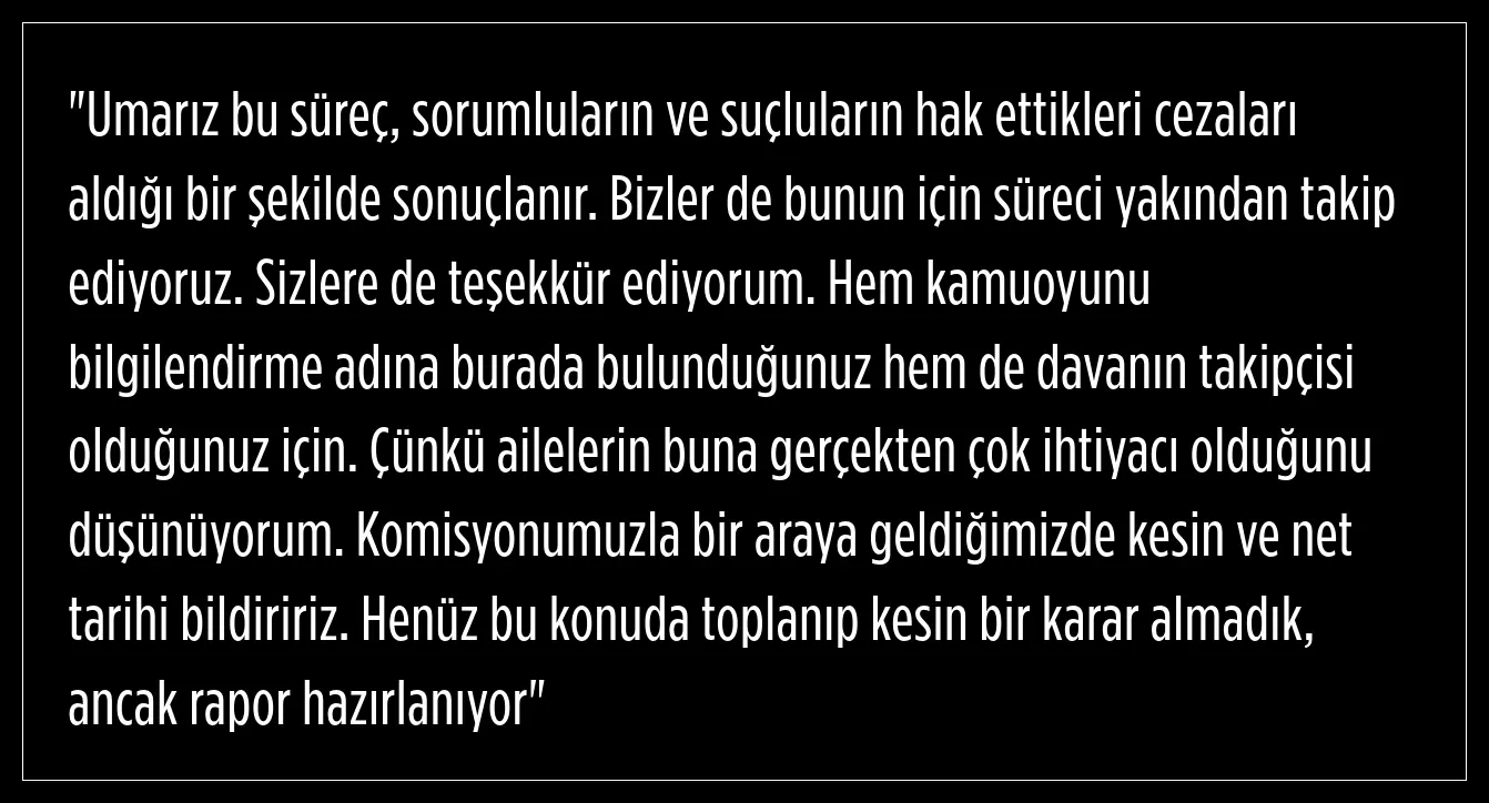 Tuba Köksal, her duruşmanın aileler için yeniden acıların yaşandığı bir süreç olduğunu vurgulayarak, mahkemenin ve komisyonun takipçisi olarak adaletin sağlanacağını belirtti.