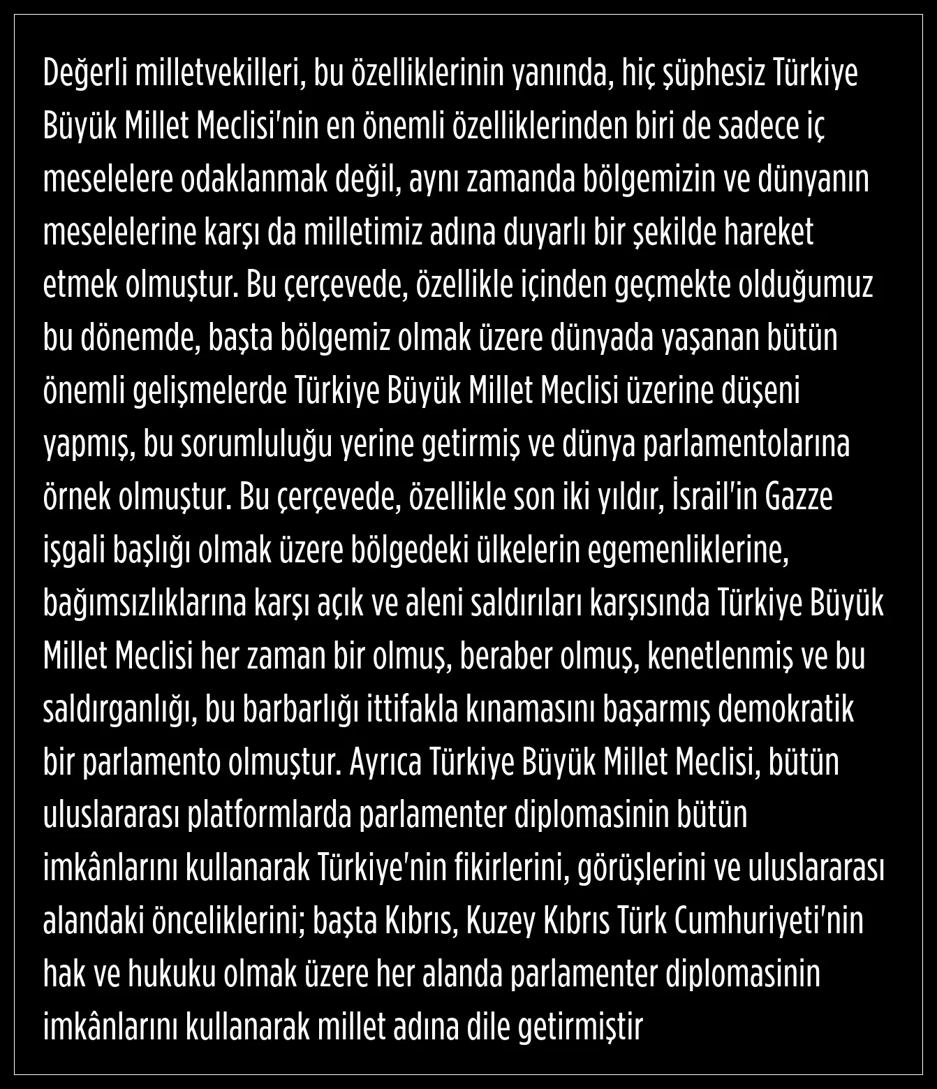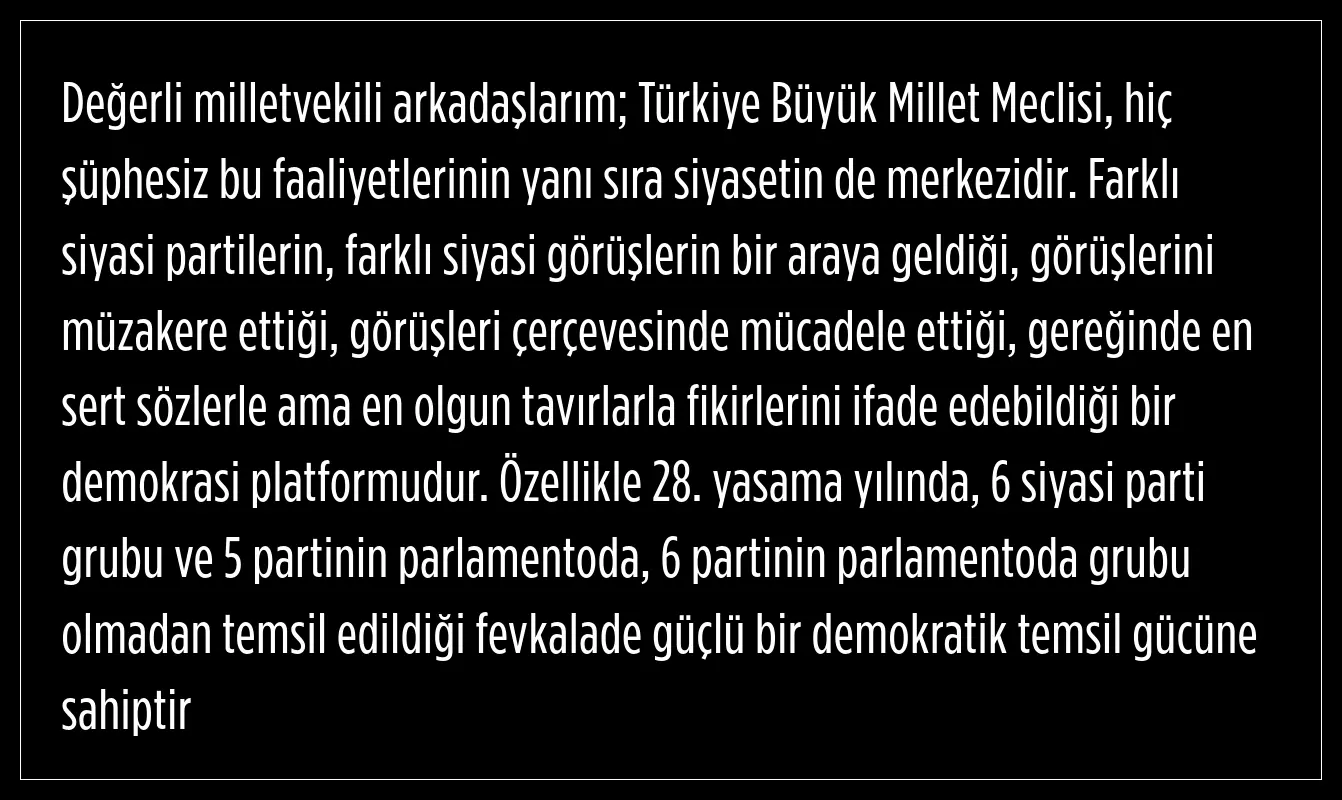 TBMM Başkanı, Türkiye Büyük Millet Meclisi'nin farklı fikirleriyle milletin fikirlerinin tecelli ettiği bir yer olduğunu ve siyasi meşruiyetin de yegane ve hiçbir şekilde sarsılmaz kaynağı olduğunu ifade etti. Bunu bu tartışmalara not düşmek bakımından dile getirmeyi TBMM Başkanı olarak bir sorumluluk olarak telakki ettiğini ifade etti.