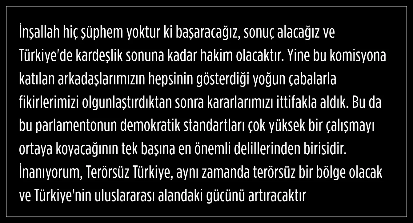 Hiç şüphesiz bu tarihi fırsatı, bu tarihi komisyonun fedakar ve gayretli çalışmalarıyla taçlandıracaklarını söyleyen TBMM Başkanı Numan Kurtulmuş, milletin ayağına vurulmuş olan bu pranganın geride kalacağını aktardı.