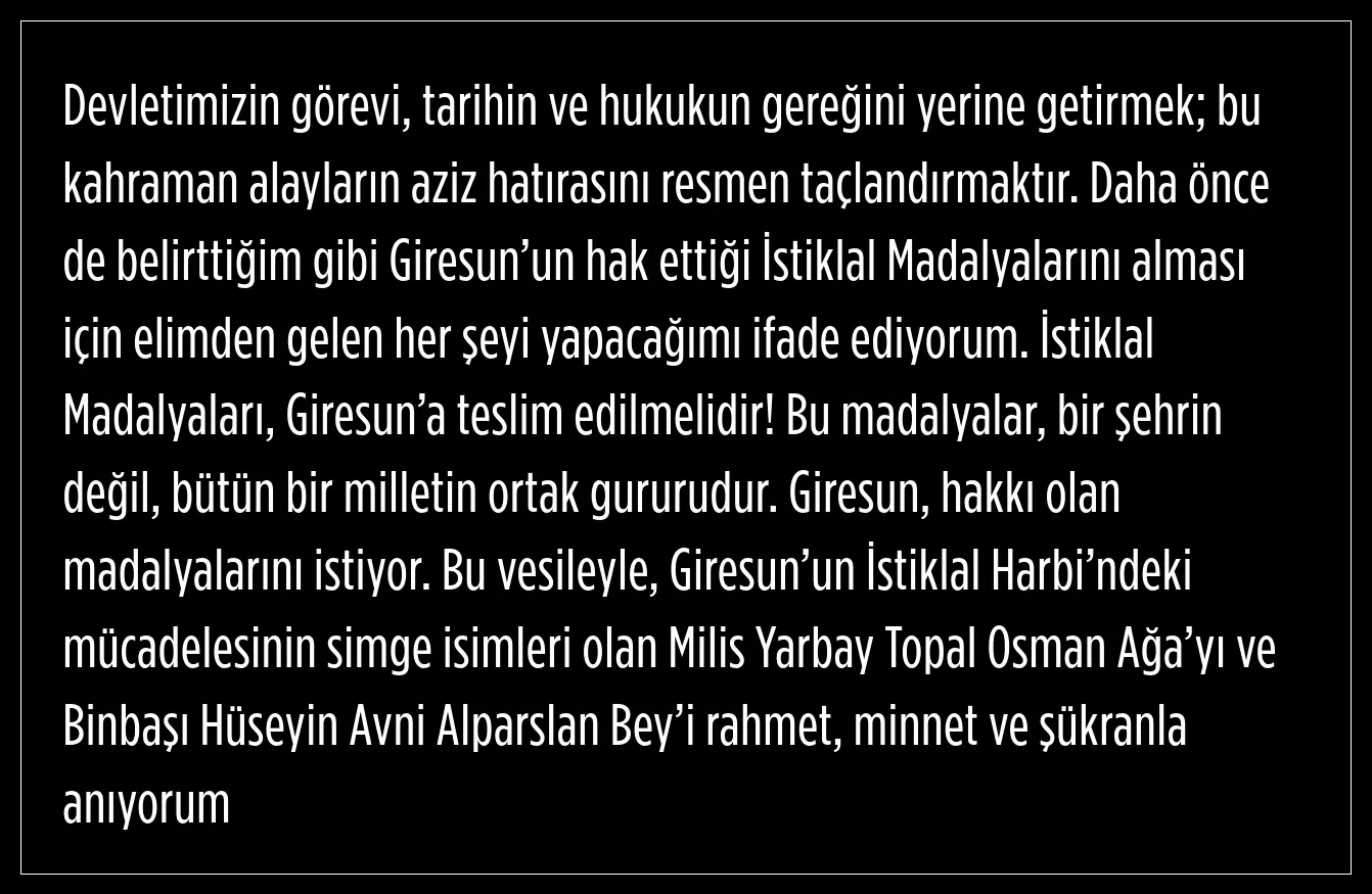 İstiklâl Harbi’nde Giresun’un gönüllü evlatları tarafından oluşturulan 42., 44. ve 47. Alayların Sakarya Meydan Muharebesi’nden Dumlupınar’a kadar cephelerin en ön saflarında kahramanca mücadele ettiğini, 26 Ocak 1939 tarihinde kabul edilen ve 7 Şubat 1939 tarihli Resmi Gazete’de yayımlanan 3579 sayılı Kanun ile İstiklâl Madalyası Kanunu’na ek yapılan düzenlemede, bu üç alayın İstiklâl Madalyası ile onurlandırılması hükme bağlandığını ifade eden Burak Akburak, aradan geçen 86 yıla rağmen bu kararın gereği yerine getirilmediğini ve söz konusu madalyaların bugüne kadar Giresun'a teslim edilmediğini söyledi.