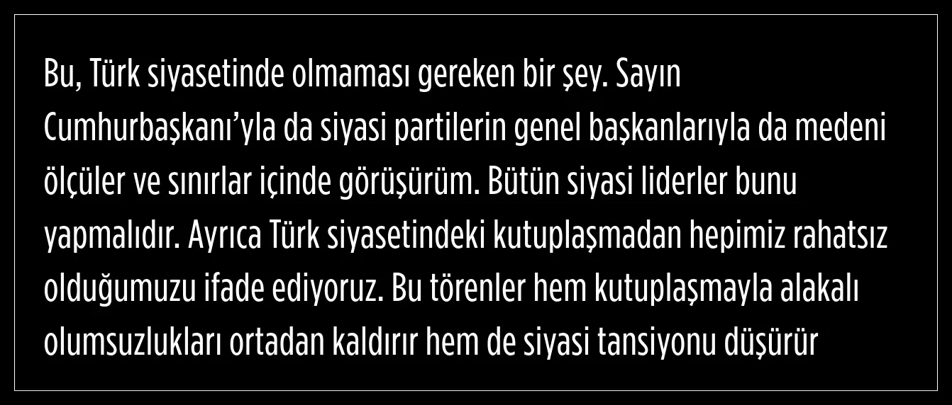 Resepsiyona girdiği ilk dakikalarda Cumhurbaşkanı Erdoğan, MHP'liler ve DEM Partililerle bir görüşme gerçekleştirdi. Resepsiyonda Tören Salonu'nun yanında bulunan Mermerli Salon'da dikkat çeken bir zirve gerçekleştirildi.