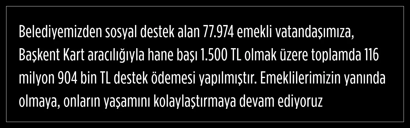 Emeklilere yönelik desteklerini sürdüren Ankara Büyükşehir, son olarak 77.974 emekli vatandaşa toplamda 116 milyon 904 bin TL destek sağlandı.