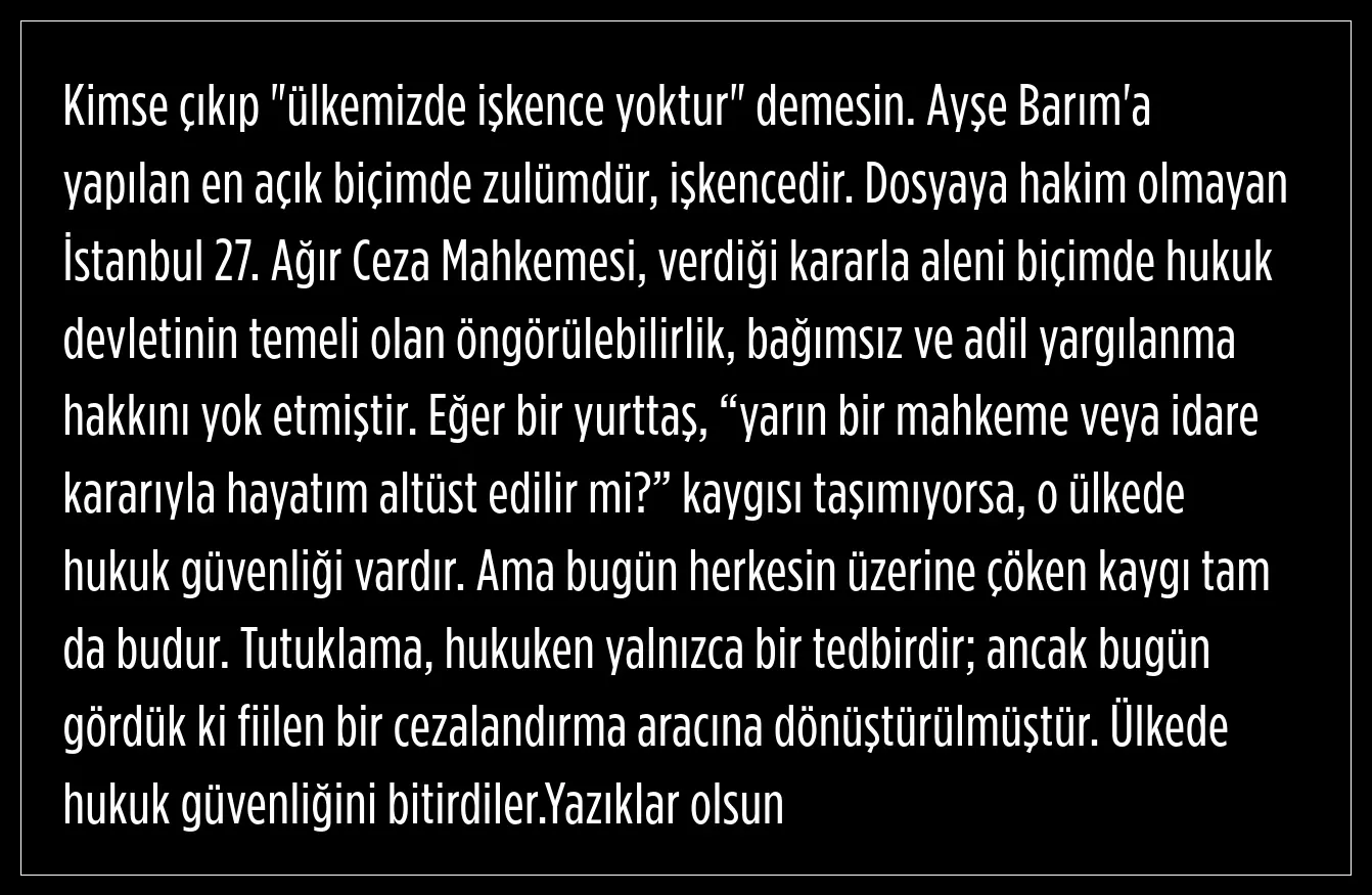 Sosyal medya hesabı üzerinden bir paylaşım yapan Gamze Taşcıer, Ayşe Barım'a yapılanın en açık biçimde zulüm ve işkence olduğunu ifade etti.
