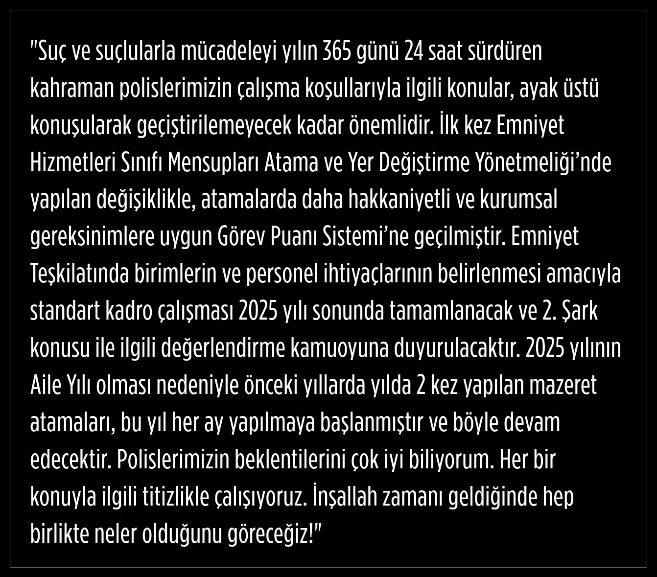 Bakan, 2025’in Aile Yılı ilan edilmesi dolayısıyla, daha önce yılda iki kez yapılan mazeret atamalarının bu yıl her ay yapılmaya başlandığını açıkladı. Yerlikaya, uygulamanın yıl boyunca devam edeceğini belirtti ve polislerin beklentilerinin göz önünde tutulduğunu söyledi.