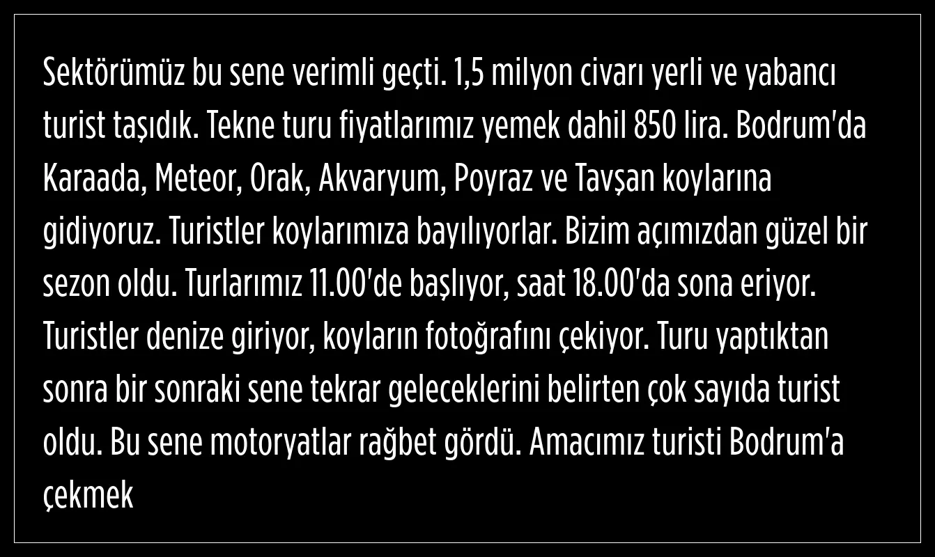 Bodrum'da sezonun mart sonunda başladığını, bu dönemde daha çok orta yaş ve üzeri misafirleri ağırladıklarını ifade eden Bodrum Otelciler Derneği Başkan Yardımcısı Alişir Şahin ise, bu dönemde fiyatlar anlamında otellerin daha ekonomik olduğunu vurguladı. Ekim ayının sonuna kadar açık olan otellerde yüzde 80-85 arası doluluk olduğunu kaydeden Şahin, Bodrum'un her kesime hitap ettiğini söyleyerek, "Bu kapsamda fiyatlar oda kahvaltı 3 bin, her şey dahil oda fiyatı ise 5 bin liradan başlıyor" dedi.