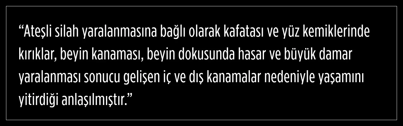 Rapora göre, Öktem’in kafa bölgesine ve yüzüne isabet eden kurşunlardan en az birinin, ayrıca sol koluna isabet eden yaralanmalardan birinin, tek başına ölümcül nitelikte olduğu tespit edildi. Uzmanlar, bu yaralanmaların her birinin, ayrı ayrı ölümle sonuçlanabilecek derecede ağır hasar oluşturduğunu belirledi.