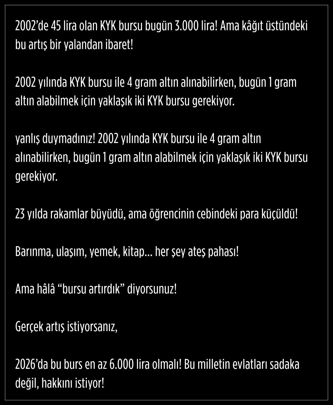 Deniz Demir, 2002’de 45 lira olan KYK bursunun bugün 3.000 lira olduğunu ancak kağıt üzerindeki bu artışın yalandan ibaret olduğunu ifade etti.