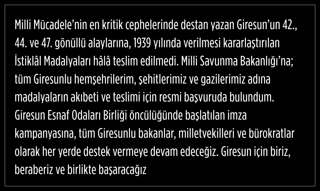 İstiklâl Harbi’nde Giresun’un gönüllü evlatları tarafından oluşturulan 42., 44. ve 47. Alayların Sakarya Meydan Muharebesi’nden Dumlupınar’a kadar cephelerin en ön saflarında kahramanca mücadele ettiğini, bu üç alayın İstiklâl Madalyası ile onurlandırılmasının hükme bağlandığını ifade eden Burak Akburak, aradan geçen 86 yıla rağmen bu kararın gereği yerine getirilmediğini ve söz konusu madalyaların bugüne kadar Giresun'a teslim edilmediğini söyledi.