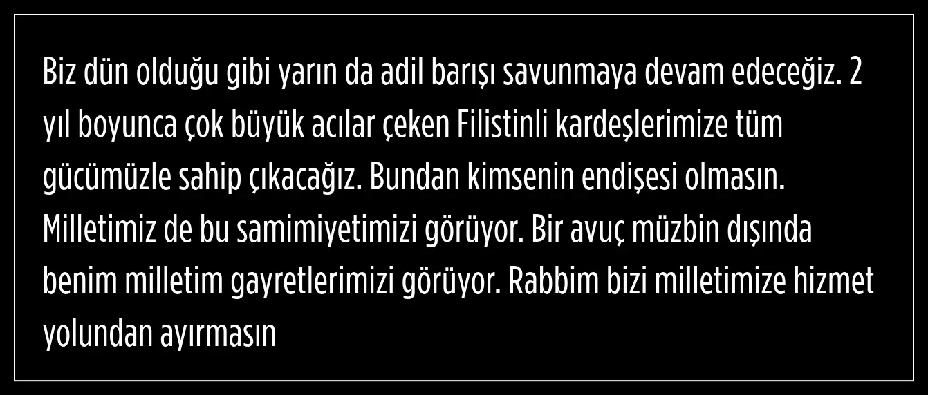 Erdoğan, Filistinlilerin özellikle Hamas'ın barışa hazır olduğunu gösterdiğini, 2 yıllık zulmün, soykırımın, vahşetin ardından Gazze'de buruk da olsa ilk defa yüzlerin gülmeye başladığını belirtti.