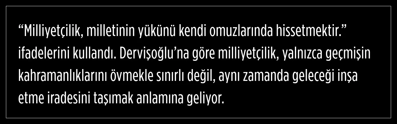 Farklı kesimlerin milliyetçiliği “manevi şuur”, “vatan sevgisi” ya da “marş coşkusu” olarak tanımladığını belirten Dervişoğlu, kendi tanımını ise şöyle yaptı: