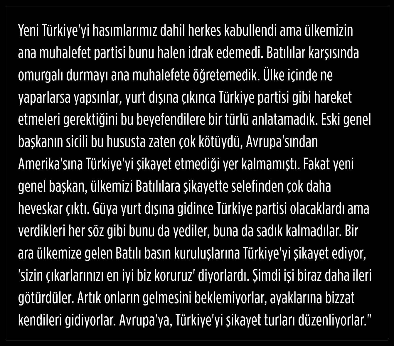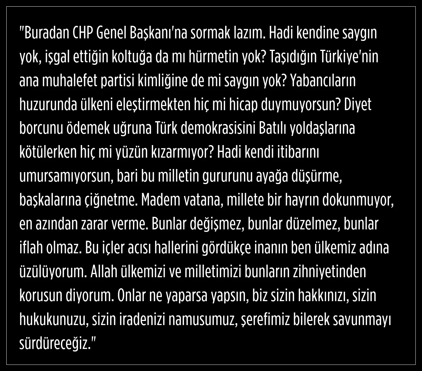 Konuşmasında CHP Genel Başkanı'na yönelik sert eleştirilerde bulunan Erdoğan, muhalefetin yurt dışındaki temaslarını eleştirdi. Eski genel başkanın sicilinden söz etti, yeni genel başkanın da ülkeyi Batılılara şikayet etmekte selefinden farklı davranmadığını kaydetti. "Yabancıların huzurunda ülkeni eleştirmekten hiç mi hicap duymuyorsun?" sorusunu yöneltti.