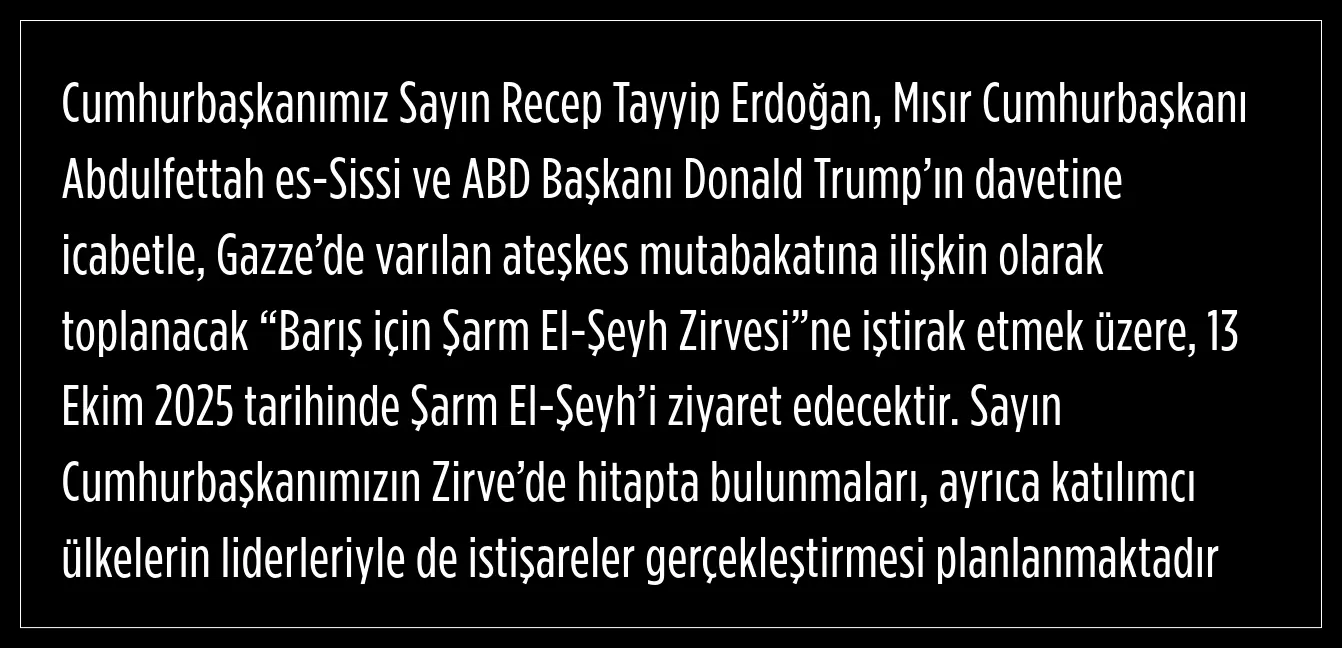 Cumhurbaşkanı Recep Tayyip Erdoğan, bugün Gazze'de varılan ateşkes için Mısır'da yapılacak “Barış için Şarm El-Şeyh Zirvesi”ne katılacak.