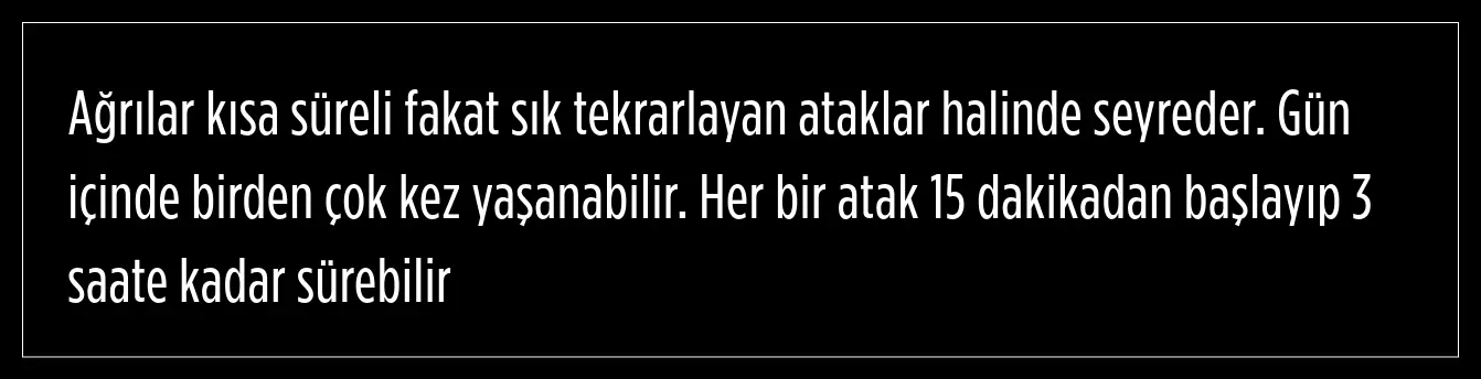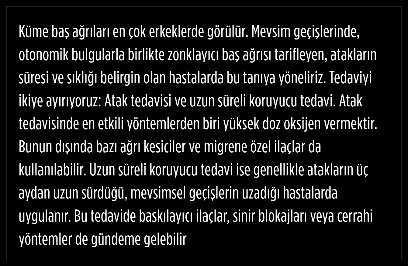 Arı, küme baş ağrılarının halk arasında çok fazla tanınmayan, iyi huylu baş ağrılarından birisi olduğunu ifade etti. Ağrının genellikle tek taraflı olduğunu ve mevsimsel geçiş dönemlerinde ortaya çıktığını kaydeden Doç. Dr. Arı, ataklar halinde gelen bu baş ağrılarının çoğunlukla sabaha karşı başladığını ve hastayı uykudan uyandırdığını söyledi.