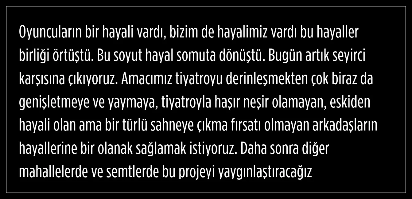 Projenin ilerleyen zamanlarda başka mahallerde de olacağını kaydeden ABB Genel Sanat Koordinatörü Arzu Balkan, bunun çok büyük bir ihtiyaç olduğunu gördüklerini ifade etti. Balkan, "Umarım çok fazla hayata dokunuruz ve tiyatroyla birçok insanı, birçok mahalleliyi kavuştururuz" dedi.