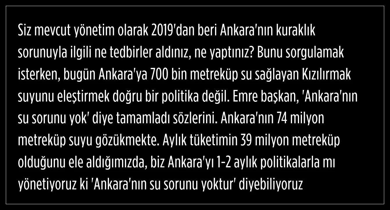 "Artık bırakın şunu. 25 yılı anlatıp, dönüp dönüp geçmişte yapılmayanlar, geçmişte yapılmayanlar" diyen Yalçın, ABB'nin 7 yıldır bugüne kadar Ankara'nın suyuyla ilgili en ufak bir çalışma yapmadığını, 1 damla ek su kaynağı temin etmediğini ve 1 metre yeni hat döşemediğini ifade etti.