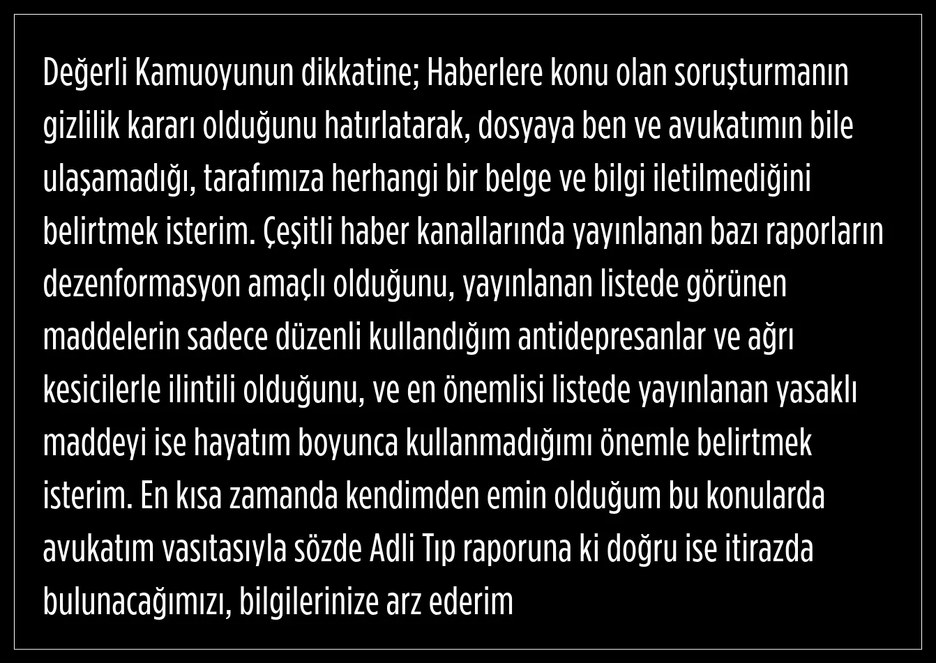Düzenli antidepresan ve ağrı kesici kullandığını ifade eden Akalay, listede yayınlanan yasaklı maddeyi hayatı boyunca kullanmadığını ifade etti.