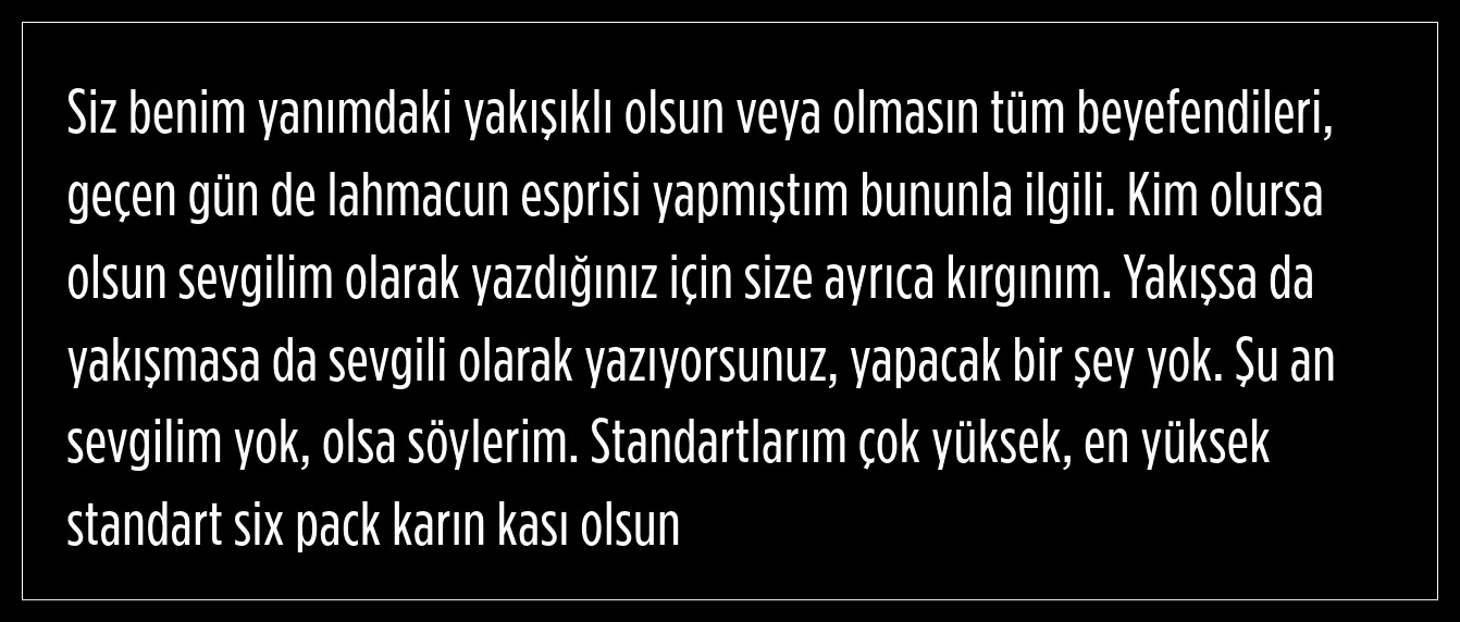 Standartlarının çok yüksek olduğunu ifade eden Cavadzade, partneri olacak kişide karın kasının olmasını istediğini belirtti.
