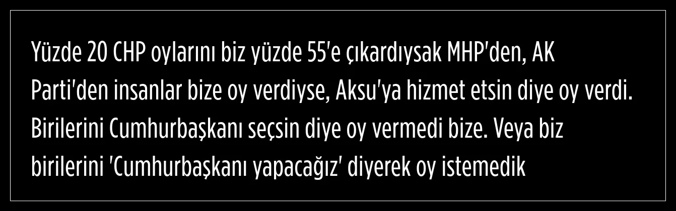 AK Parti'den davetlerin, çağrıların olduğunu kaydeden Yıldırım, geçeceklerini ifade ettiklerini belirtti. Önceliklerinin Aksu'ya hizmet olduğunu söyleyen Yıldırım, şöyle devam etti: