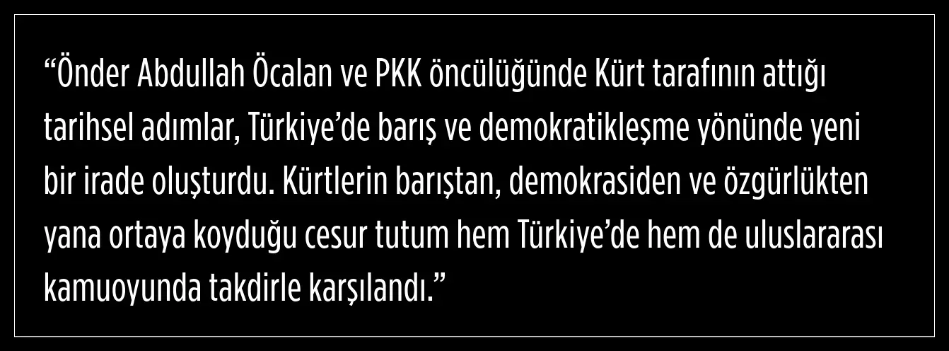 PKK'nın açıklaması, Kuzey Irak'ta düzenlenen toplantıda kamuoyuna duyuruldu. Açıklamada, Ortadoğu’daki çatışma ortamının Türkiye ve Kürtlerin geleceğini tehdit eder hale geldiği vurgulandı. Ayrıca, “Cumhurbaşkanı ve MHP Genel Başkanı Devlet Bahçeli ile Abdullah Öcalan’ın açıklamalarıyla başlayan, 27 Şubat 2025 tarihli ‘Barış ve Demokratik Toplum’ çağrısı ile şekillenen süreç kritik bir evreye girdi.” ifadeleri yer aldı.