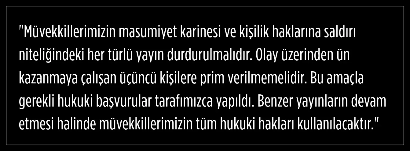 Avukat Uçanok, açıklamasında müvekkillerinin adeta bir linç kampanyasının hedefi haline geldiğini belirtti. Olayla ilgisi olmayan kişilerin sosyal medyada ve televizyon kanallarında "prim elde etmek amacıyla hukuki süreci çarpıttığını" ileri sürdü. Bu tür yayınların, adli soruşturmayı etkilediğini ve müvekkillerin özel hayatlarına saygı gösterilmesini talep etme haklarını ihlal ettiğini vurguladı.