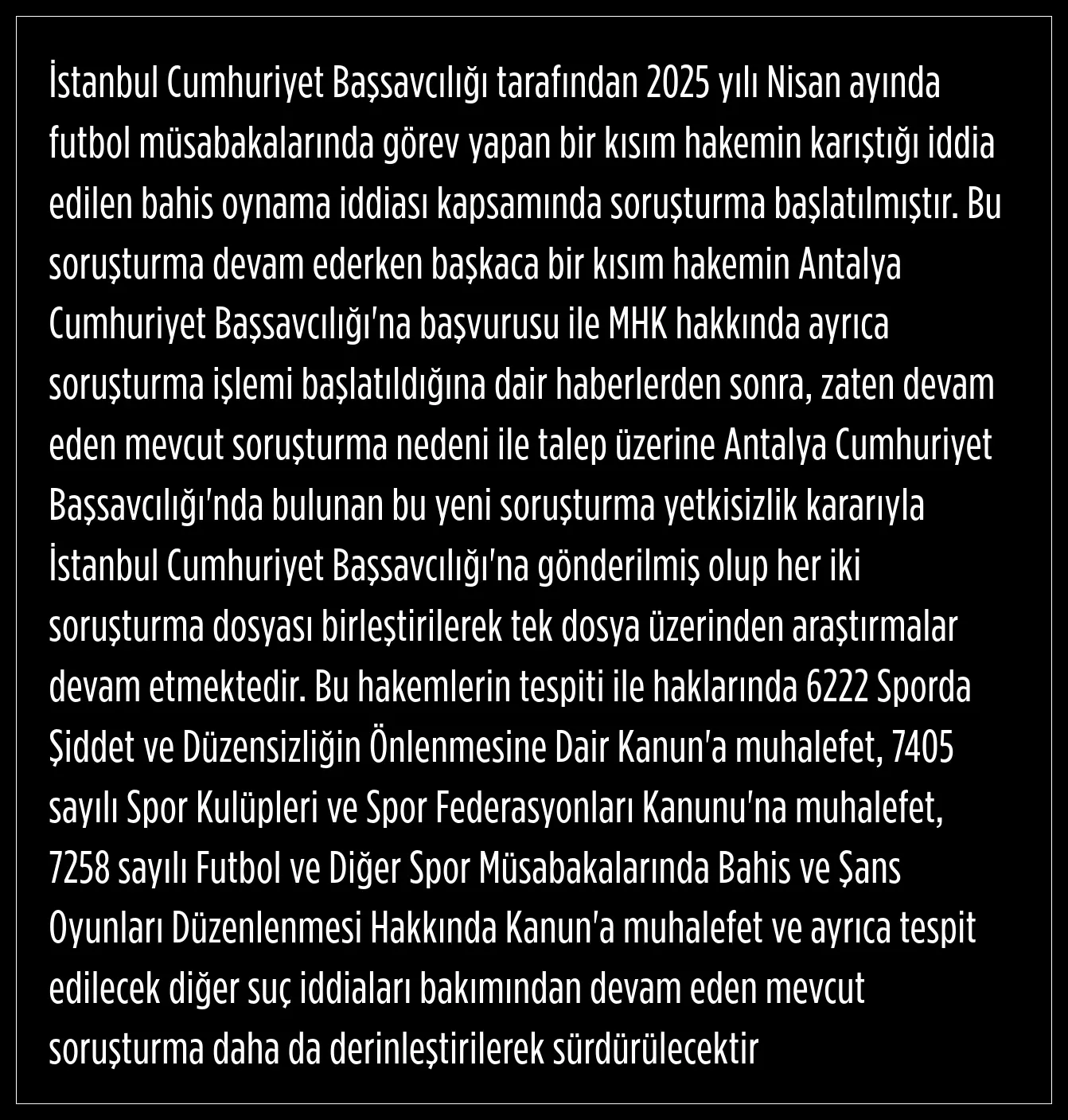 Başsavcılık, hakemlerin karıştığı iddia edilen bahis olayıyla ilgili soruşturmanın 2025 Nisan ayında başlatıldığını açıkladı.