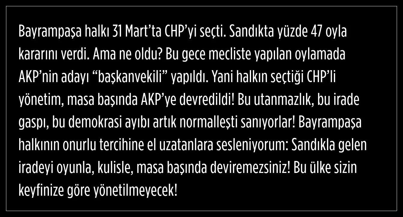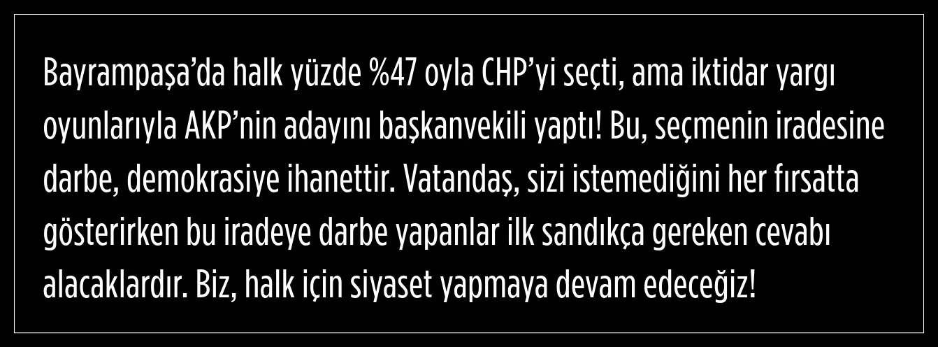 Bayrampaşa'da halkın iradesinin yok sayıldığını kaydeden Tekin Bingöl ise, kayyum ve baskılarla Bayrampaşa Belediyesinin CHP yönetiminden alınarak AK Parti'ye devredildiğini bu konusu tanımalarının mümkün olmadığını kaydetti. Bingöl, halkın oyuna sahip çıkmaya ve demokrasiyi korumaya kararlı olduklarını ifade etti.