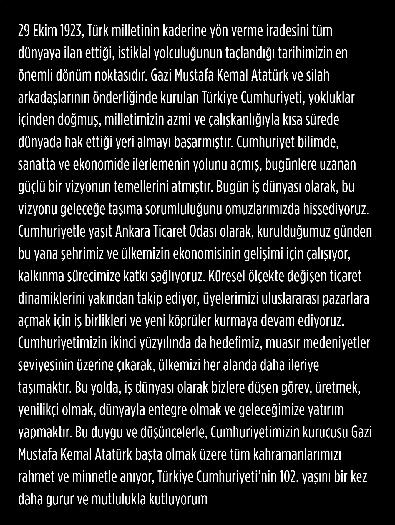 Ankara Ticaret Odası (ATO) Yönetim Kurulu Başkanı Gürsel Baran, 29 Ekim dolayısıyla bir mesaj yayımladı.