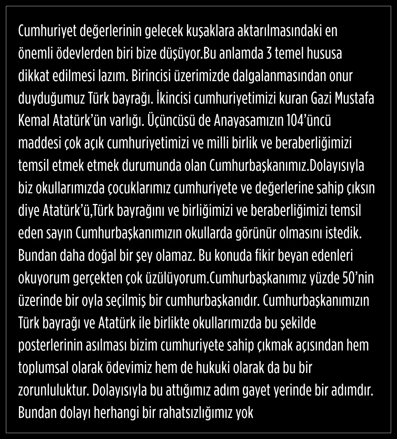 Yusuf Tekin, Atatürk’ün, Türk Bayrağı'nın ve Cumhurbaşkanının okullarda görünür olmasını istediklerini ve bundan daha doğal bir şey olmayacağını ifade etti.