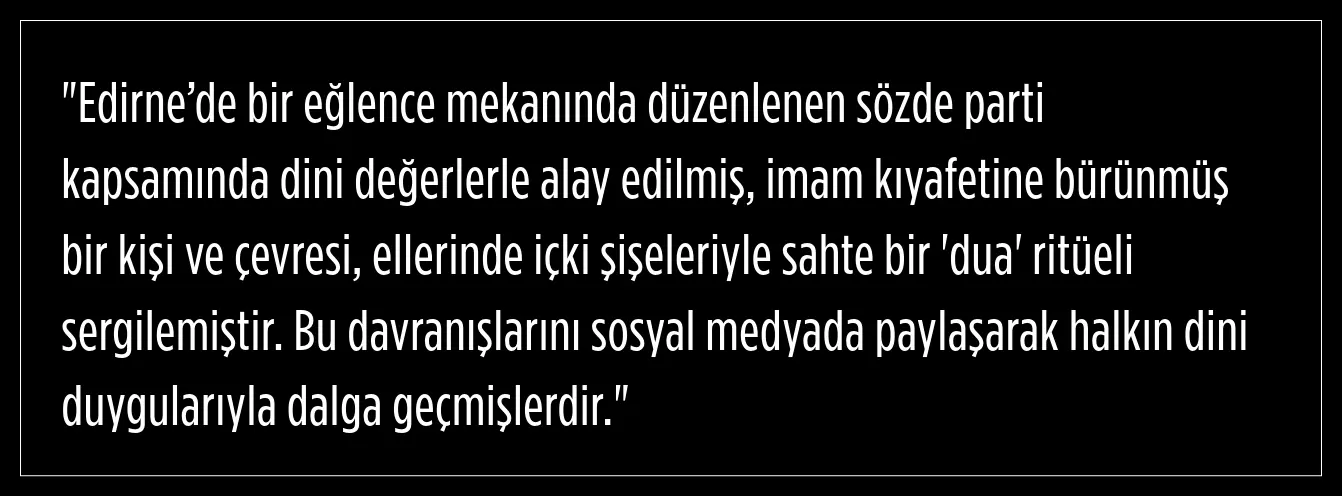 Edirne’de düzenlenen bir kostüm etkinliğinde imam cübbesi giyen ve elinde alkol şişesiyle dua eder gibi poz veren şüpheli, güvenlik güçleri tarafından adliyeye sevk edildi. Olay, sosyal medyada yayılan fotoğraflarla geniş yankı buldu.
