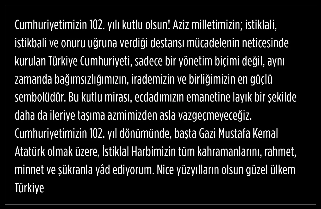 Türkiye Cumhuriyeti’nin kurucusu ve büyük lideri Mustafa Kemal Atatürk tarafından milletimize armağan edilen Cumhuriyetimizin 102. yılı kutlanıyor. Atatürk’ün en büyük eserim dediği Cumhuriyet, yurt genelinde büyük bir gurur ve sevinçle anılıyor.