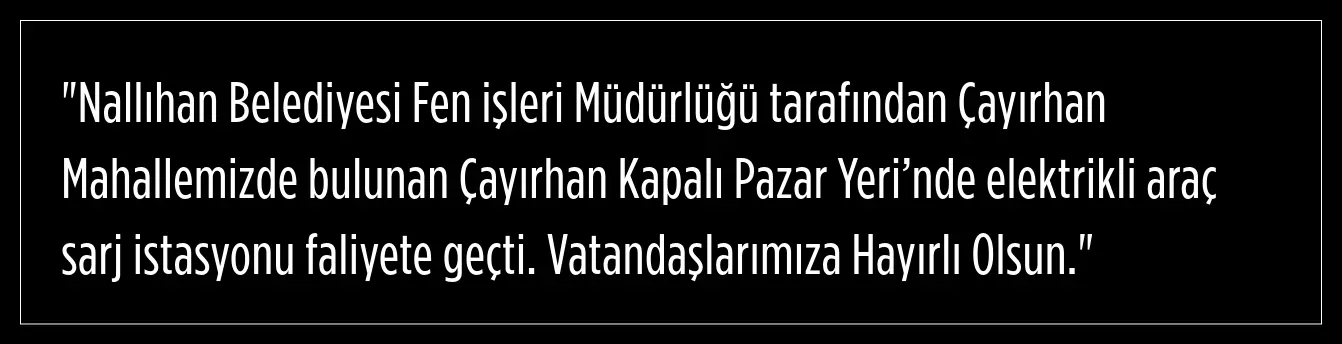 Nallıhan Belediyesi, Çayırhan Mahallesi’nde vatandaşlara kolaylık sağlamak amacıyla elektrikli araçlar için yeni bir şarj istasyonu kurdu. Belediye yetkilileri, istasyonun Çayırhan Kapalı Pazar Yeri içinde hizmete girdiğini duyurdu.