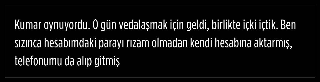 Akın E., Sevim Erdoğan'ın evine gitti. Şahıs, alkol aldıkları sırada Erdoğan'ın sızmasıyla oyuncunun telefonunu aldı ve bankasında bulunan 225 bin TL'yi kendi hesabına attı.