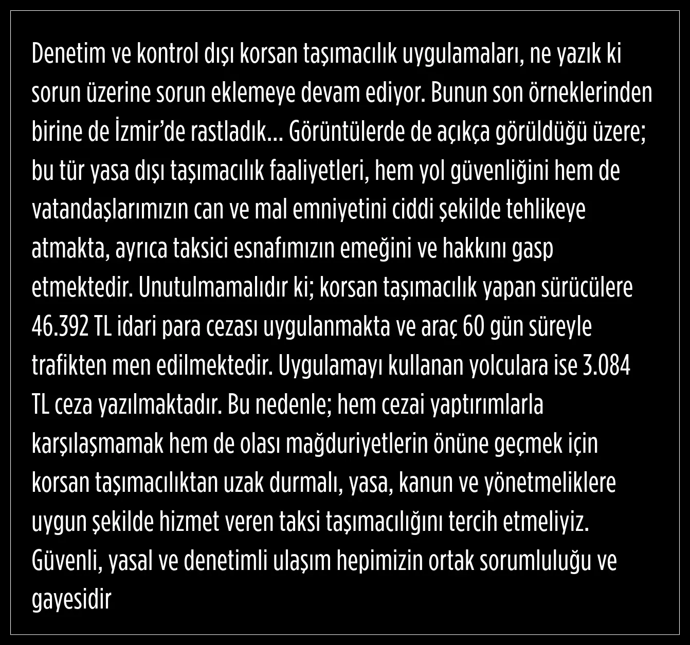 Bunun son örneğine İzmir'de rastlandığını kaydeden Mehmet Yiğiner, bu tür yasa dışı taşımacılık faaliyetlerinin hem yol güvenliğini hem de vatandaşların can ve mal emniyetini ciddi şekilde tehlikeye attığını, taksici esnafının emeğini ve hakkını gasp ettiğini ifade etti.