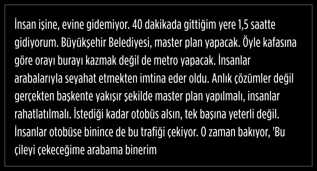 Etimesgut'tan Kızılay'a kadar devamlı trafik olduğunu belirten Kılıç, akşam saatlerinde 17.00 gibi başladığını ve yoğunlaştığını söyledi. Ekstra yolların açılmasıyla trafik rahatlayacağını aktaran Enes Kılıç, Mamak tarafında metro ve toplu taşıma olmadığı için insanların sıkıntılı yaşadığını söyledi. Bu saatlerin yoğun ve iş çıkış saatleri olmasından ötürü insanların taksi kullandığını ve yetmediğini belirtti.