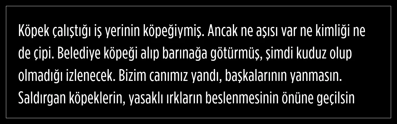 Köpeğin ilk olarak kafasına zıpladığını ardından kafasını ısırdığını ifade eden Mehmet Serkan Akirmak, kafasını çevirdiği anda kolundan ısırdığını, 10-15 saniyelik bir arbedede halen kolunu bırakmadığını söyledi. "Enfeksiyon kapması, kolumda doku ölmesi oluştu" diyen Akirmak, gece rüyalarına girecek derecede korktuğunu belirtti. Bir daha bir köpeğe derece yaklaşabileceğini asla düşünmediğini söyleyen Mehmet Serkan Akirmak, köpeğin herhangi bir kimliğinin veya aşısının olmadığını aktardı.