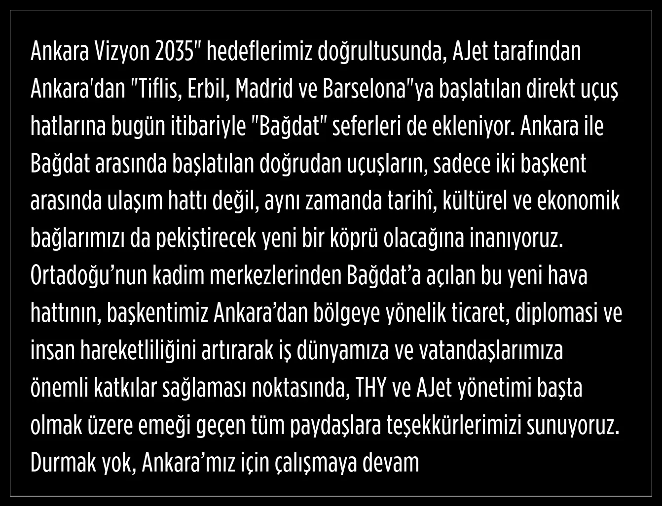 Ankara Milletvekili, THY ve AJet yönetimi başta olmak üzere emeği geçen tüm paydaşlara teşekkürlerini iletti.