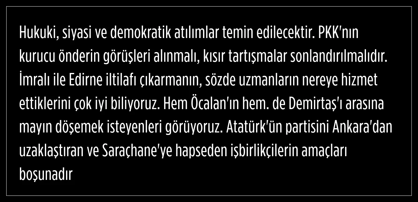 Ankara'da Türkiye Büyük Millet Meclisi'nde çalışmalarını sürdüren Milli Dayanışma, Kardeşlik ve Demokrasi Komisyonu'ndan seçilecek milletvekillerinin İmralı'ya giderek ilk ağızdan ve ilk elden ihtiyaç duyulacak mesajları alması gerektiğini, MHP'nin bu heyete hazır olduğunu aktardı. Bahçeli, örgütün tamamen çekildiğini duyurmasının Terörsüz Türkiye sürecinde kayda değer olduğunu söyledi.