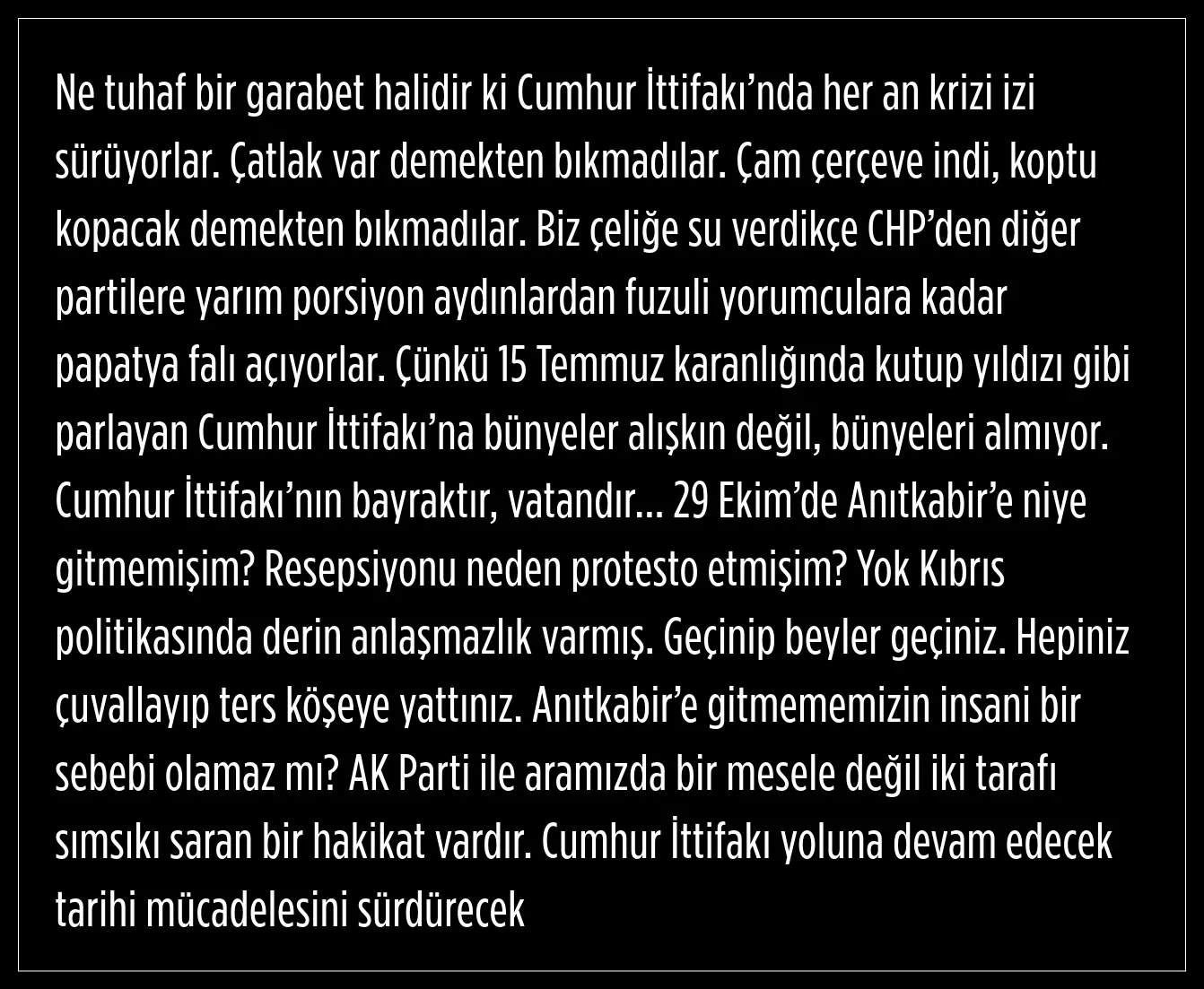Devlet Bahçeli'nin 29 Ekim'de Anıtkabir'e gitmemesi ve Cumhurbaşkanlığı Kabinesi'nde düzenlenen resepsiyona katılmaması 'Cumhur İttifakında' bir kriz mi var? iddialarını gündeme taşımıştı. Bahçeli, bu iddialara da yanıt verdi.