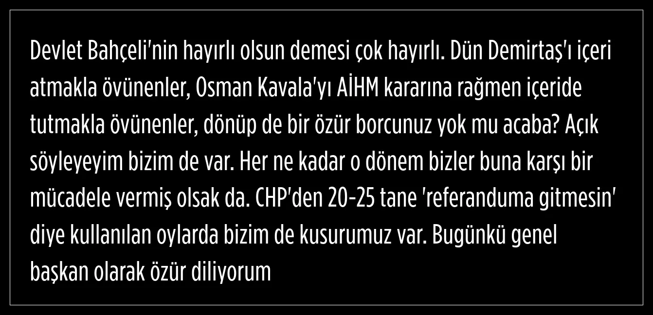 Milliyetçi Hareket Partisi Genel Başkanı Devlet Bahçeli'nin Demirtaş'la ilgili sözlerine, "Bugün hayırlısı bu diyorsanız dönüp bir özür borcunuz yok mu? Açık söylüyorum bizim de var" dedi.