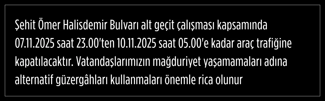 ABB'nin resmi sosyal medya hesabından yapılan açıklamada, Şehit Ömer Halisdemir Bulvarı'nda alt geçit çalışması yapılacağı açıklandı.